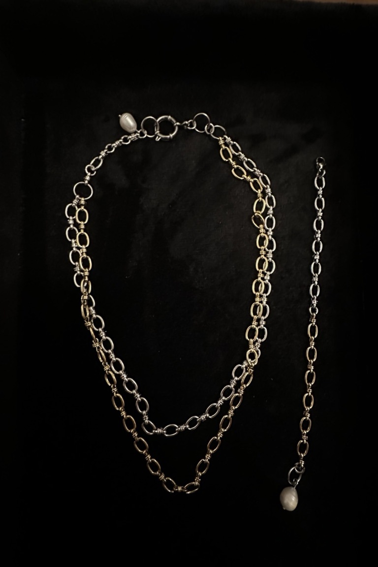 Designed for the fearless, it combines silver with warm golden tones, proving that true elegance lies in contrast, finished with a delicate freshwater pearl detail for a touch of elegance.